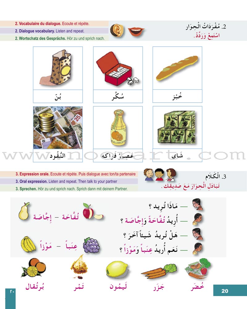 This series is dependent on Modern Standard (formal) Arabic; it does not use any of the various Arabic dialects, nor does it use a second language to explain things. It does, however, utilize the most advanced methods and ways for teaching second languages, while taking into account the nature of the Arabic language. The series is also guided by the curriculums and teaching methods of The Common European Framework of Reference (Cadre européen commun de référence pour les Langues), which was put together by the Council of Europe. This framework is the basic reference guide for teaching languages in Europe from all angels (objectives, content, teaching methods and styles, etc.). It is a result of the work of language instruction experts in 41 European state members of the Council of Europe. The goal of utilizing this framework is to allow Arabic to take its rightful place in Europe (and the West in general), alongside the other living languages of the world.