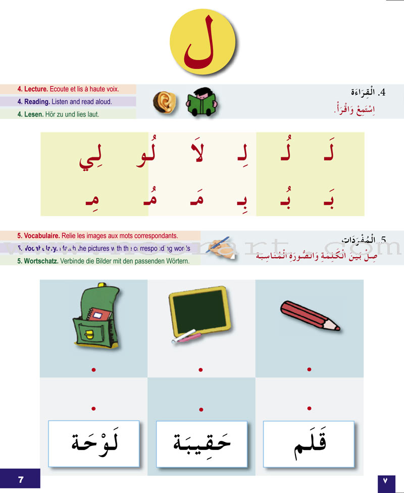 The “I Learn Arabic: Multi-Lingual Series” is the same as the “I Learn Arabic: Simplified Curriculum Series,” with one exception – the multi-lingual series has introductions and instructions in four different languages: Arabic, French, English and German. The rest of the series’ content is in Arabic, and is not translated to these languages. The series is perfectly suited for students who come from non-Arabic speaking families, and who need a mediating language to understand instructions.