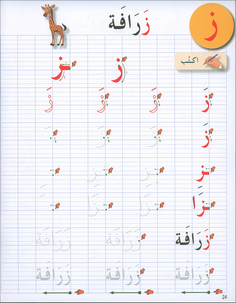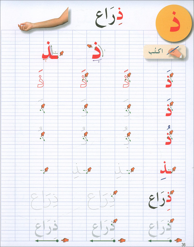 الكتابة: يتدرّب الطلاب على كتابة الحروف، ثم ربطها لتكوين الكلمات، وتساعد الرسوم التوضيحية على تصور الكلمات.