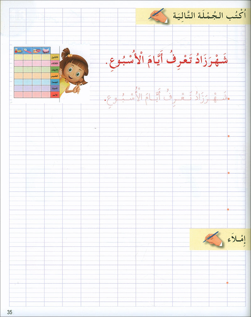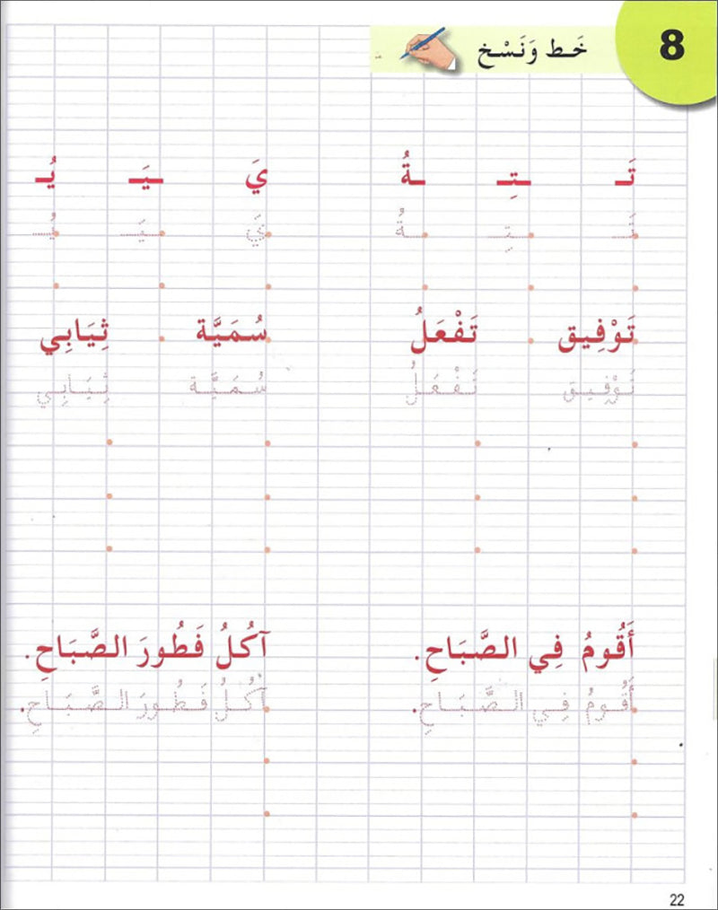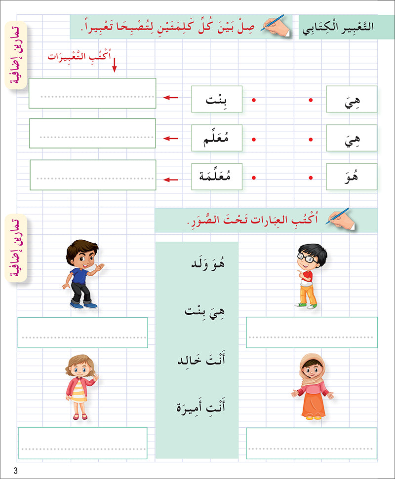 الكتابة: يتدرّب الطلاب على كتابة الحروف، ثم ربطها لتكوين الكلمات، وتساعد الرسوم التوضيحية على تصور الكلمات.